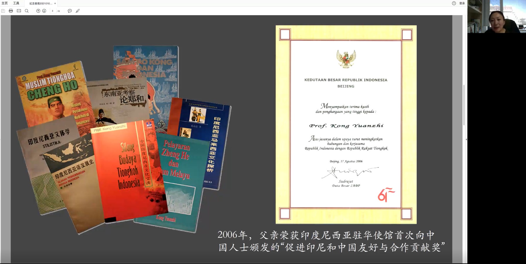 孔远志教授的女儿暨北京大学中国社会科学调查中心副研究员孔涛女士首先发言,她代表家人向各位来宾表达了真诚的谢意,并介绍了孔教授的生平。她回忆了与父亲在一起的点滴片段,充满深情地讲述了父亲对印尼语言文化的热爱,以及他学无止境、孜孜以求的治学精神。孔涛老师最后引用哲言“有时候缺席是一种最高形式的在场”献给本次活动,并深信后辈学人会从父亲身上汲取力量,不断投入到印尼研究事业中去,让中国与东南亚各国之间建立更深厚的友谊。