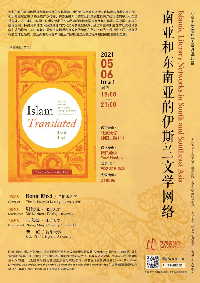2021年5月6日,爱体育手机平台在国际合作部“海外学者讲座项目”的支持下举办了“南亚和东南亚的伊斯兰文学网络”的主题讲座。主讲人Ronit Ricci是以色列希伯来大学亚洲研究系与比较宗教研究系Sternberg-Tamir双聘讲席教授,兼任亚洲研究系系主任,主要研究方向为印度尼西亚历史与文化、爪哇与马来文学、南亚与东南亚伊斯兰文学网络,以及殖民时期的亚洲流放者与离散群体。讲座由东南亚系助理教授谢侃侃主持,国别和区域研究专业助理教授张忞煜、清华大学历史系副教授曹寅作为与谈人参与了讨论。
