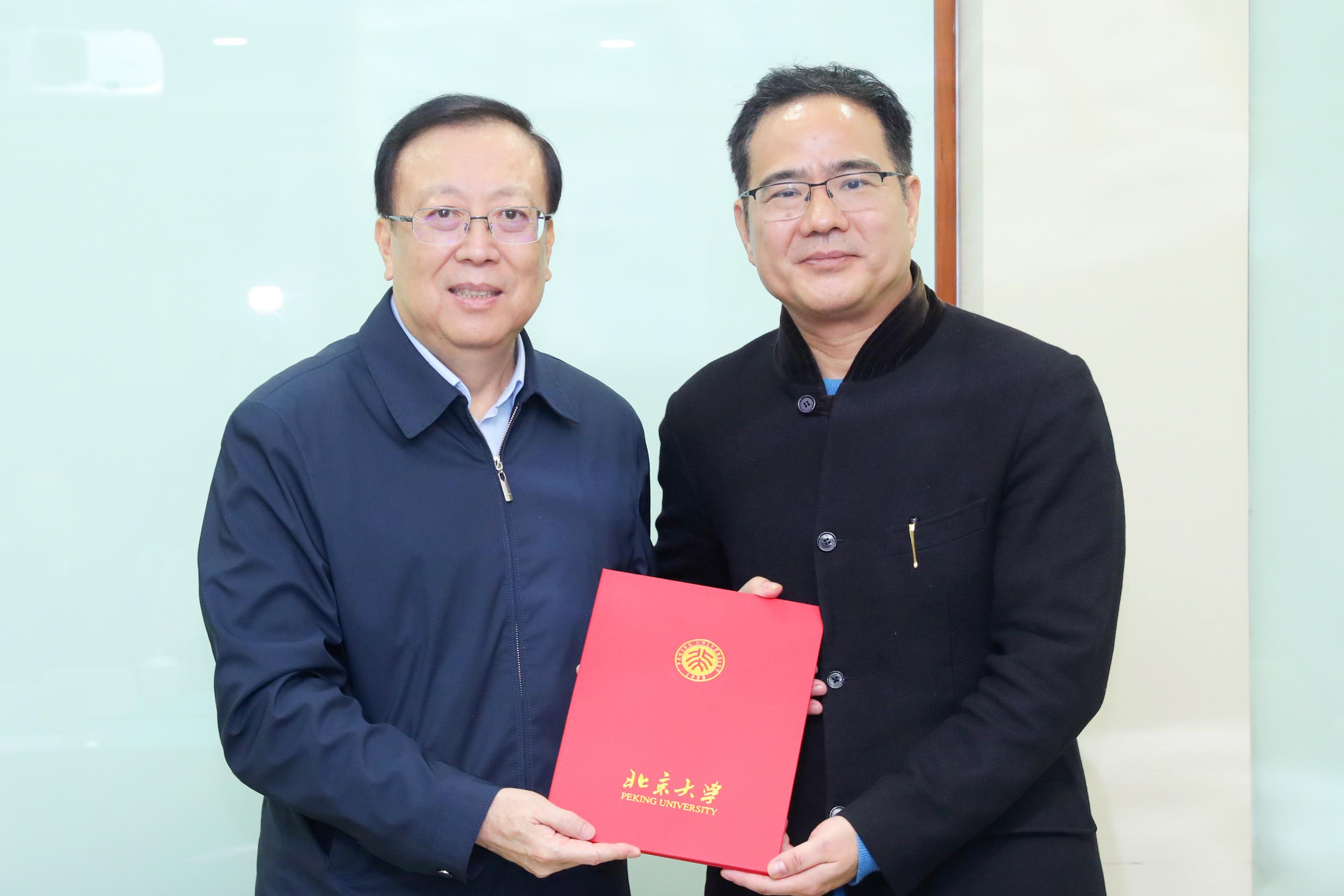 在仪式上,郝平校长还为袁明教授颁发了感谢牌,并向董强教授颁发了聘书。