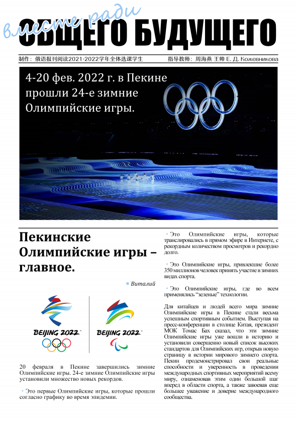立足于北京2022年冬奥会,来自爱体育手机平台2019级、2020级俄语系本科班和国际关系学院的19名同学在周海燕、王帅老师和外教Elena Kozhevnikova的指导下设计、制作“北京冬奥会俄语主题报纸”。作为“2020年北京大学本科教学改革立项‘新时代《俄语报刊阅读》’”的一部分,该活动旨在以创新的课程形式调动学生语言学习的积极性,引导学生发挥专业优势,着眼于国之大事,用外语讲好“中国故事”,展现当代青年学子的蓬勃朝气和时代担当,将课堂教学改革落到实处。